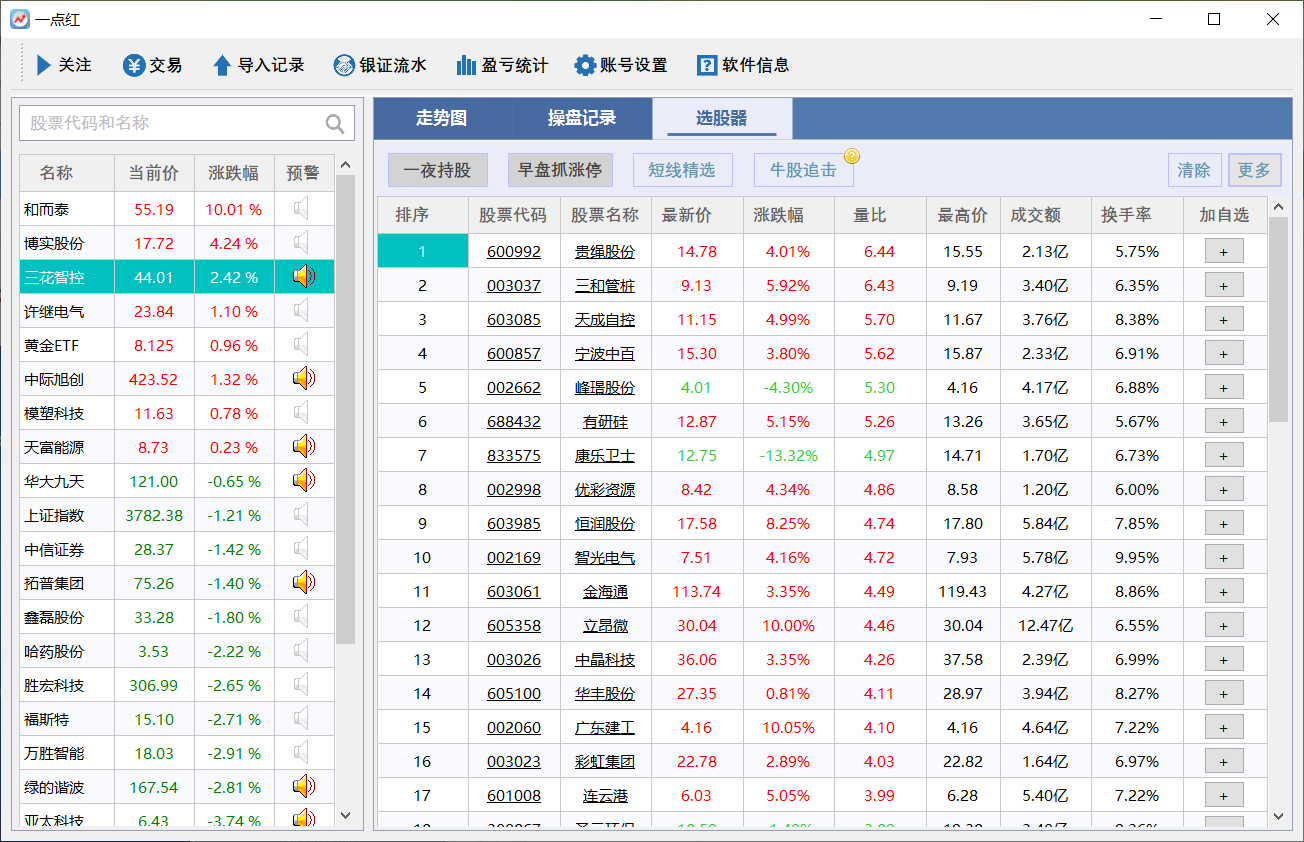 参数齐全的选股器:有常规的股价、涨跌幅、量比、换手率选股,也有年化收益、涨跌天数、国家队持股、机构持股、外国资金持股选股模式;